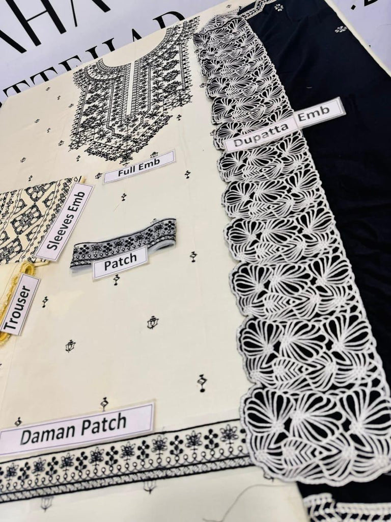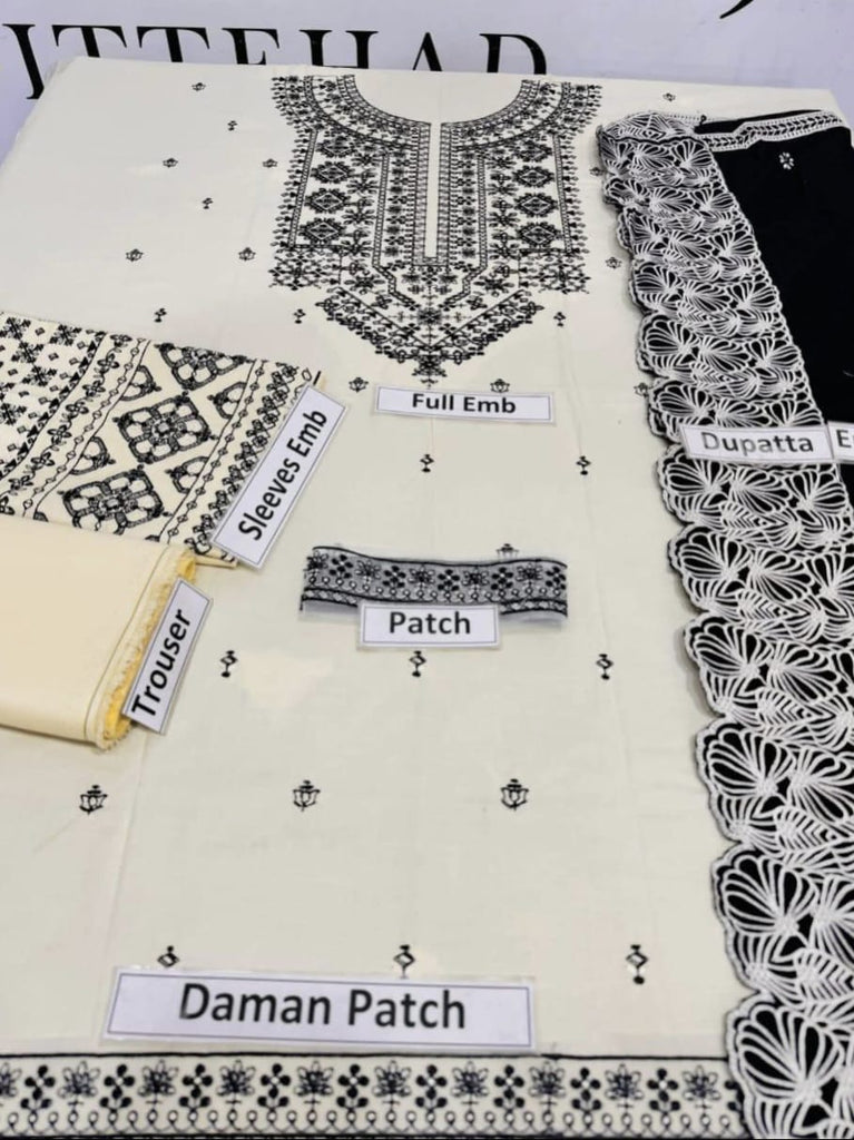 Designed with rich full heavy embroidery on the front, sleeves, and daman, this outfit embodies elegance and grandeur. The trouser features embroidered patches for a refined finish, while the plain Dhanak base ensures balance and wearability. Completing the look is a 4-sided heavy embroidered Dhanak dupatta with cutwork detailing, adding an opulent touch to this exquisite winter ensemble.
